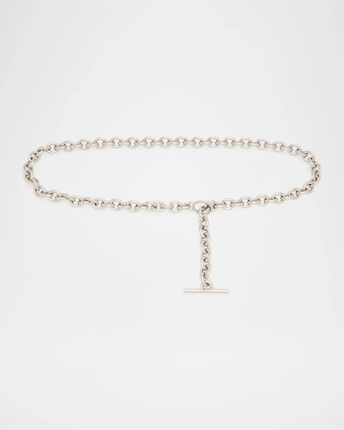 McQueen chain belt crafted from shiny silvertone brass TBar detailing with engraved logo Adjustable length Toggle clasp closure Can be worn on the waist or hips Brass Made in Italy