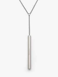 Palladium-finished chain necklace featuring a statement smooth metal T-Bar pendant engraved with the McQueen logo. Lobster clasp closure with skull charm. Adjustable length. Eco-brass hardware. Product details - Eco brass hardware - Palladium finish - Lobster clasp closure - Total length when closed at first link: 55cm / 21.6 inches - Product code: 809400J161N0926 - Made in Italy - Material: Brass
