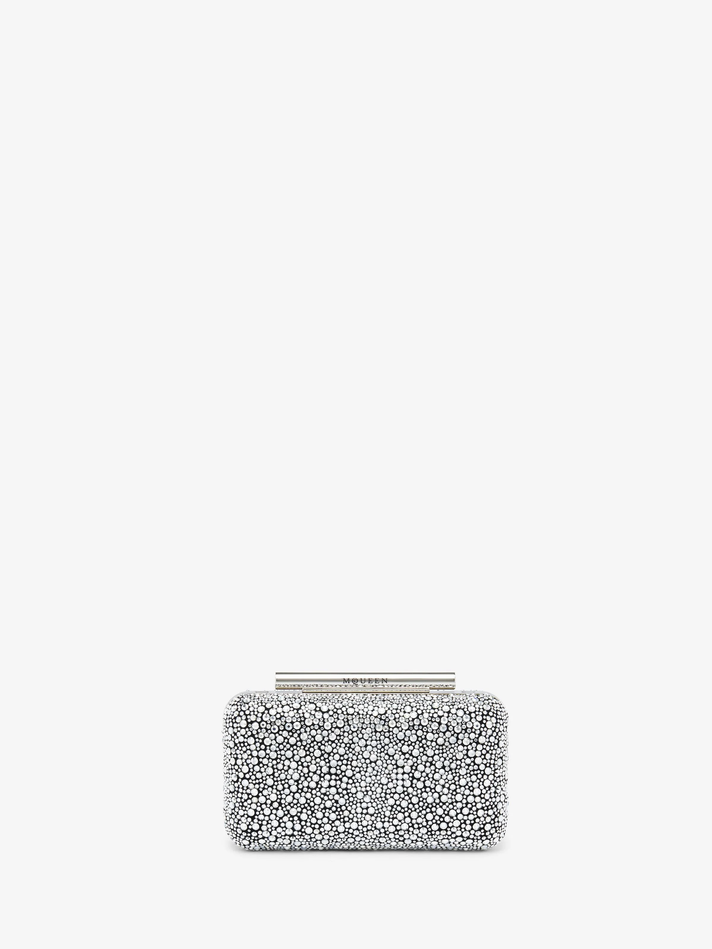 The McQueen T-Bar box clutch – black suede calf leather embellished with silver round strass and studs. Silver tone T-Bar clasp closure engraved with the McQueen logo. Can be worn handheld or on the shoulder with the removable chain strap. Product details - Dimensions: Length 19 x Height 10 x Depth 4.5cm / 7.4 x 3.9 x 1.7 inches - Strap drop: 53cm / 20.8 inches - T-Bar clasp closure with McQueen logo - One main compartment - Extractable metal hooks for detachable chain strap - Brass hardware with silver tone - Black suede calf leather lining - Product code: 8137151BLOQ1000 - Made in Italy - Material: Calf Leather
