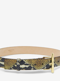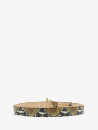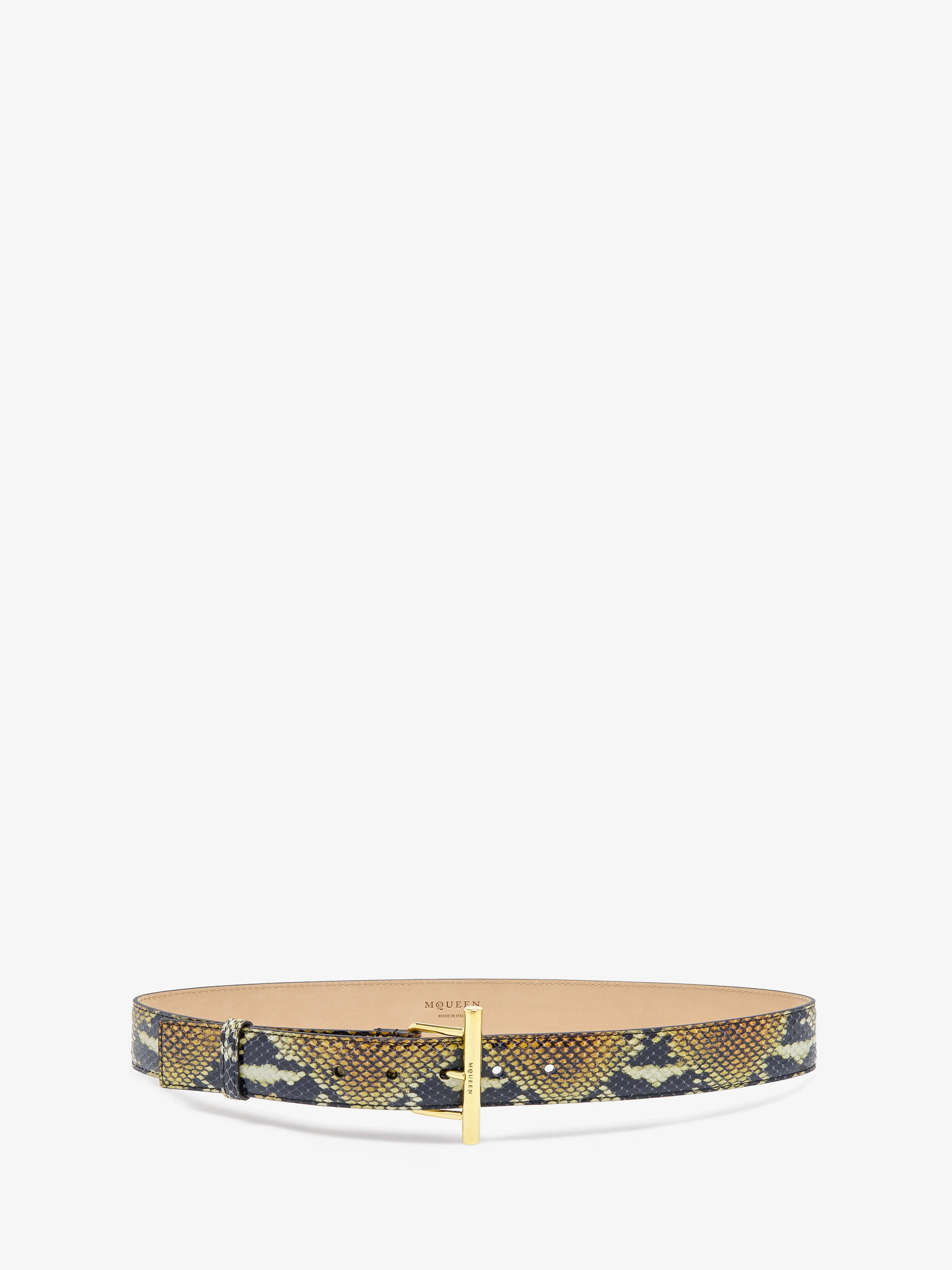The T-Bar Hip Belt – brown calf leather with a python-effect print. Finished with a statement T-Bar buckle in gold tone metal, engraved with the McQueen logo. Product details - Width: 3.5 cm / 1.3 inches - T-Bar buckle: 6.5 cm / 2.5 inches - Eco brass hardware with shiny gold finishing - Product code: 80449917HB18490 - Made in Italy - Material: Calf Leather