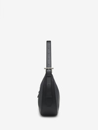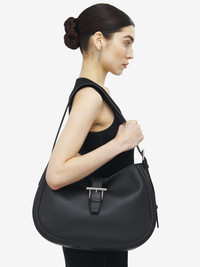 The T-Bar Shoulder Bag – rounded slouchy silhouette crafted from black smooth calf leather. Can be worn on the shoulder using the adjustable leather strap. Detailed with a statement T-Bar buckle in antique silver tone metal engraved with the McQueen logo. Product details - Dimensions: Length 40 x Height 27 x Depth 10 cm / 15.7 x 10.6 x 3.9 inches - Adjustable leather strap with antique silver tone metal T-Bar buckle - Strap drop: 30 cm (5th hole) / 11.8 inches - T-Bar length: 6.5 cm / ?? inches - Magnetic fastening - One main compartment with zip pocket - Black canvas lining - Product code: 8379141MAAD1000 - Made in Italy - Material: Calf Leather