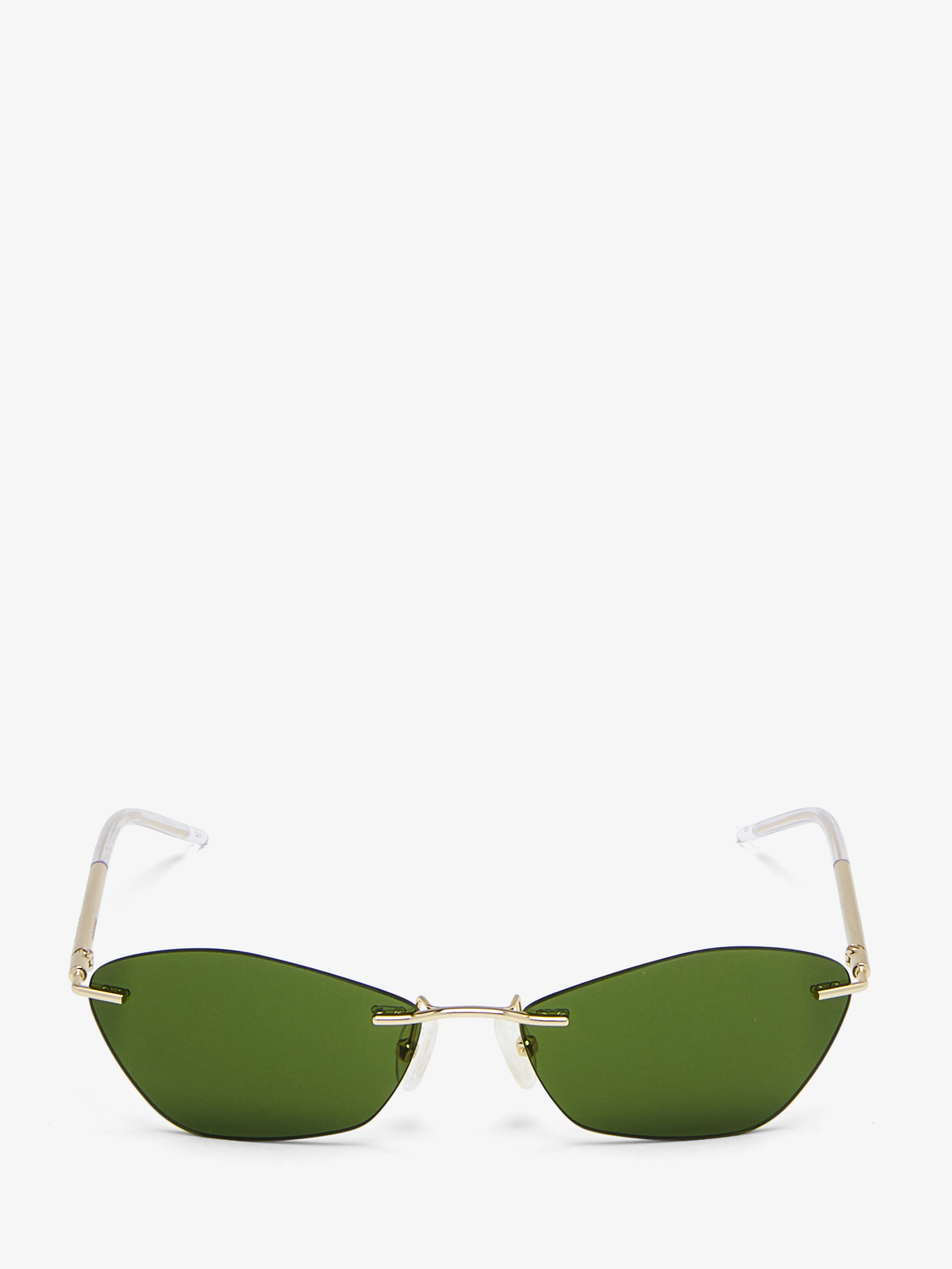 Light gold tone metal sunglasses fitted with solid green lenses and adjustable nose pads. The sunglasses have a rimless construction with a slim geometric shape and feature the T-Bar detail as part of the temples. The metal temples are finished with the lasered McQueen logo and transparent acetate end tips. All Alexander McQueen Eyewear is 100% certified UV protective (UVA and UVB rays). Product details - Product code: 852610I33302075 - Made in JAPAN - Material: Metal
