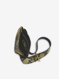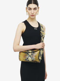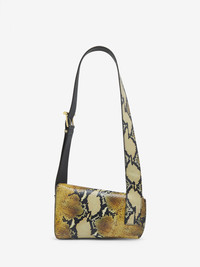 The T-Bar Sling Bag – asymmetrical and handcrafted from a single piece of grainy brown calf leather with a python-effect print. Can be worn crossbody using the adjustable leather strap. Detailed with a statement T-Bar buckle in shiny gold tone metal engraved with the McQueen logo. Product details - Dimensions: Length 20 x Height 13-16 x Depth 0.5-12 cm / 7.8 x 5.1-6.2 x 0.1-4.7 inches - Adjustable leather strap with shiny gold tone metal T-Bar buckle - Strap drop: 42-55 cm / 16.5-21.6 inches - T-Bar length: 9 cm / 3.5 inches - McQueen metal lettering and external metal D-ring on the side - Magnetic and zip fastening - One central zip compartment with card slot and metal D-ring - Beige suede calf leather lining - Product code: 83465517HB18490 - Made in Italy - Material: Calf Leather