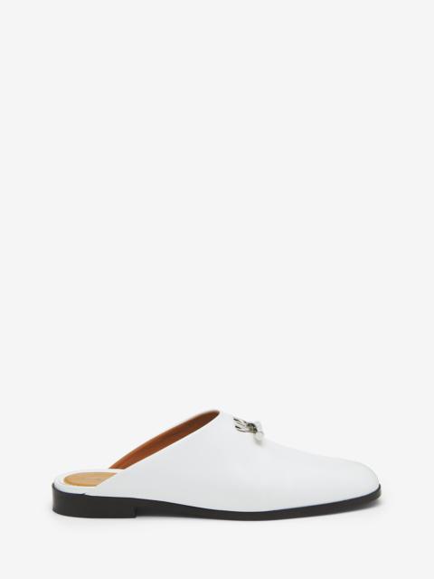 The T-Bar Slip-On Mule—white calf leather with a round toe silhouette. Silver metal T-Bar detailing engraved with the McQueen logo. Finished with a low stacked heel. Product details - Round toe - Leather sole - Heel height: 20 mm / 0.7 inches - Product code: 831088WIAER9081 - Made in Italy - Material: Bull Leather