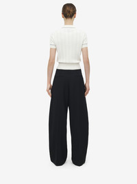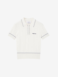 Polo shirt in ivory viscose blend with contrast navy piping. Point collar with 3-button placket, short sleeves and textured micro-stitch design. Finished with an embroidered McQueen logo on the chest. Product details - Point collar - Short sleeves - McQueen logo embroidery - Product code: 839716Q1BEE9284 - Made in Italy - Material: 94% Viscose, 6% Polyester