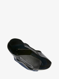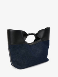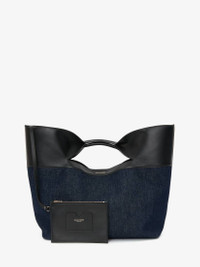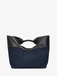 The Bow in blue denim and black smooth calf leather. This bag can be worn either hand-held or over the shoulder. Finished with a gold Alexander McQueen signature. Product Details: - Dimensions: 63 x 43 x 23 cm / 24.8 x 16.9 x 9 inches - Twisted top handle - Magnetic closure - One main compartment - Removable zip pouch with an external credit card slot Material:100% Cotton Product Code:7093441AAI54090