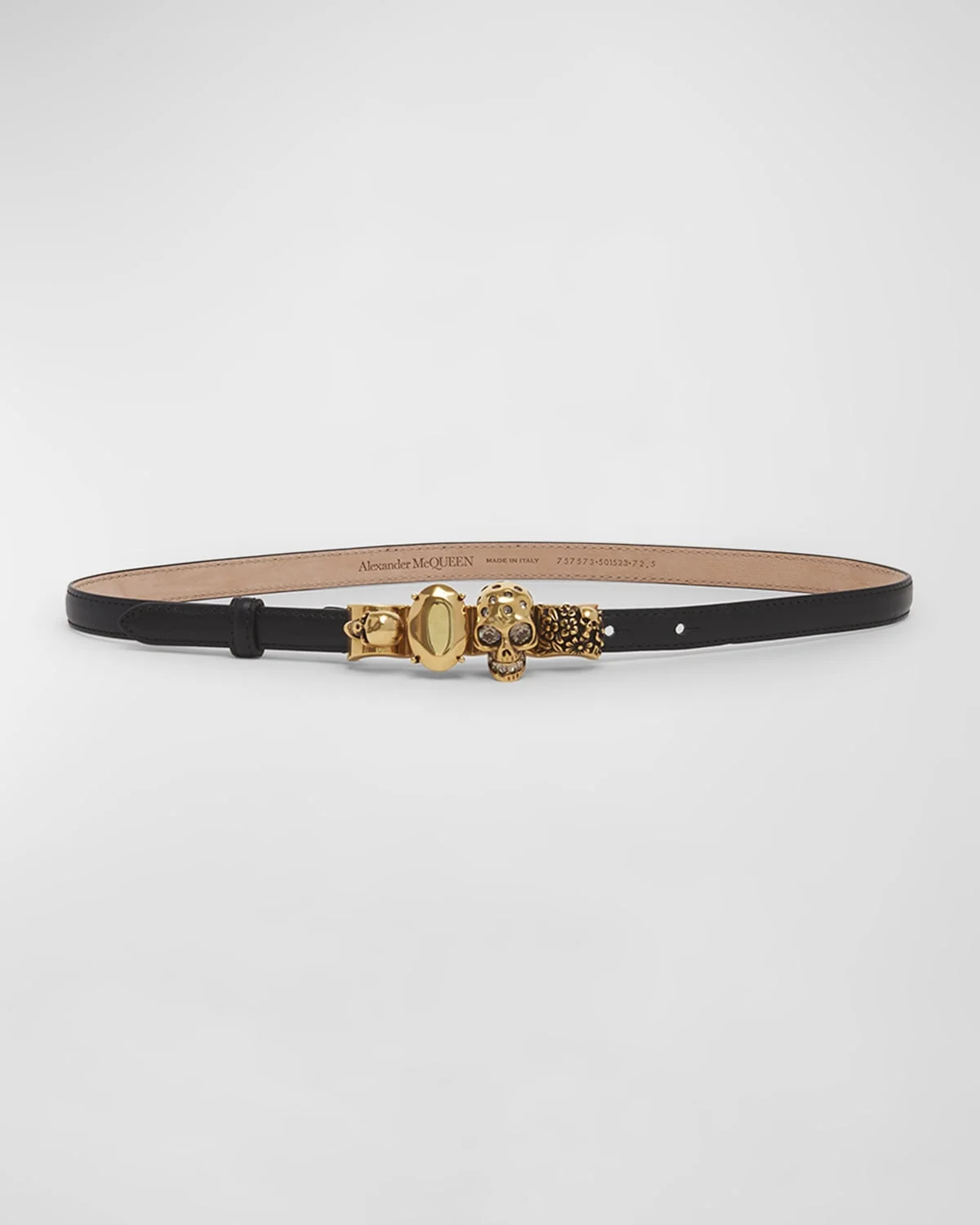 McQueen "The Knuckle" skinny belt in leather and brass Features a glass crystalembellished skull Adjustable fit Cut to size Tonal stitching Tapered end Made in Italy