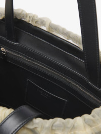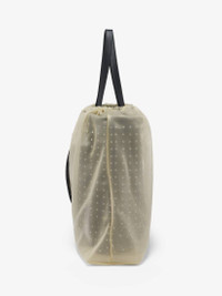 The Nebula tote - black smooth calf leather with all-over silver tone metal stud detail. Draped with mesh tulle and finished with a drawstring closure. Carried handheld or on the shoulder with leather handles and detailed with with a metal plaque engraved with the McQueen logo. Product details - Dimensions: Length 37 x Height 42 x Depth 10 cm / 14.5 x 16.5 x 3.9 inches - Handles drop: 28 cm / 11 inches - Drawstring fastening featuring black leather cords ending with skull-signed metal cubes - One central compartment - Internal zip pocket with card slot - Lined in an innovative plant-based fabric - Product code: 8044321VP111000 - Made in Italy - Material: Goatskin