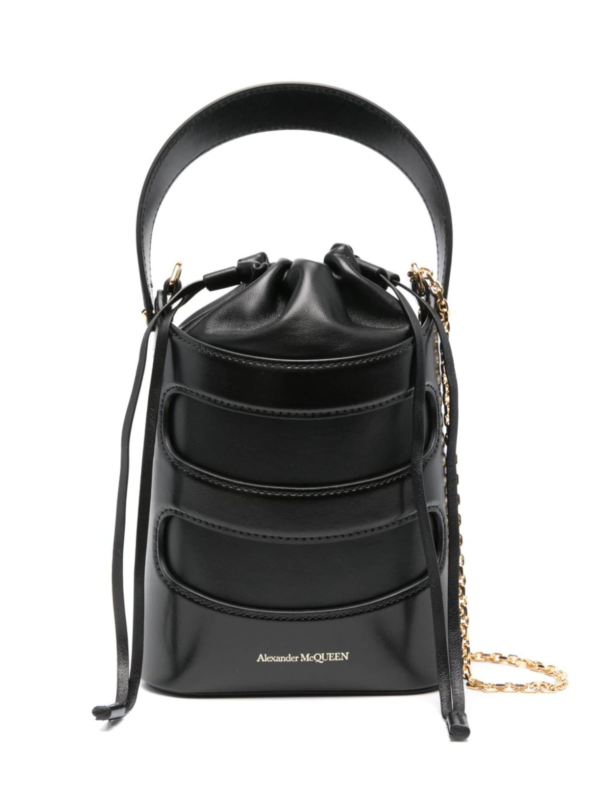 black calf leather brushed finish bucket body single top handle detachable chain-link shoulder strap logo print to the front main compartment full lining gold-tone hardware top drawstring fastening This piece comes complete with a protective dust bag. Size & Fit Model Measurements: Bust: 0cm Height: 0cm Hips: 0cm Waist: 0cm DEPTH: 6cm HEIGHT: 23cm STRAP: 120cm WIDTH: 15cm Fabric and Care Designer Style ID: 7959001VPGI Designer Colour: 1000 BLACK Composition: Outer: Calf leather 100%