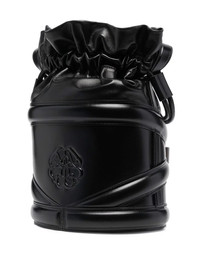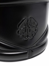 The Soft Curve bucket bag A new iteration of Alexander McQueen's recognizable bucket bag silhouette, the Soft Curve is defined by its drawstring fastening and harness-inspired tonal panels around its main compartment. Crafted from soft leather in Italy, this SS22 accessory can be worn across the body, on the shoulder or handheld thanks to its adjustable strap. Highlights - Black - Adjustable detachable shoulder strap - Drawstring fastening - Panelled design - Debossed logo to the front Made in Italy Composition Outer: Calf Leather 100% SIZE & FIT Measurement DEPTH 7.08 in(18 cm) HEIGHT 12.2 in(31 cm) WIDTH 7.08 in(18 cm)