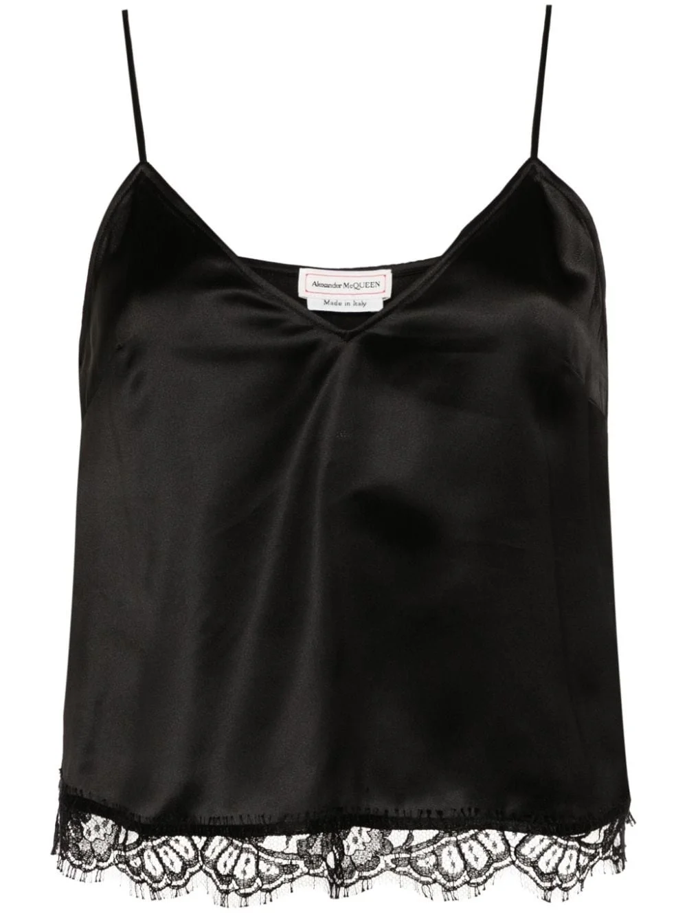 lace-trim satin crop top Highlights - Black - Cotton blend - Satin finish - Lace trim - V-neck - Adjustable spaghetti straps - Sleeveless - Unlined - Cropped Made in Italy Composition Viscose 100%, Cotton 72%, Polyamide 28% SIZE & FIT Model measurements Height 5 ft 10 in(1.77 m) Bust/Chest 32.28 in(82 cm) Hips 35.03 in(89 cm) Waist 25.19 in(64 cm) FittingInformation Designed for a slim fit that sits just away from the body offering a close yet comfortable fit The adjustable shoulder straps allow for a preferred fit when worn Made from a lightweight non-stretch fabric This piece fits true to size – take your usual size