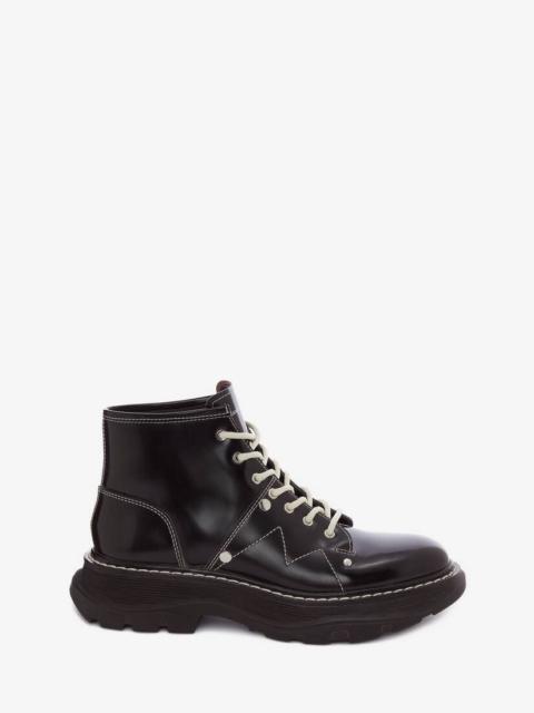 Black shiny calfskin leather lace-up boot with silver-finished metal hardware, contrast stitching and a thick ice pink oversized rubber tread sole. Boot silhouette with a round toe shape. Finished with an Alexander McQueen signature on the tongue. Material: 100% Calf Leather