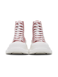 High-top satin sneakers in pink. Round rubber cap toe in white. Lace-up closure in white. Logo printed in silver-tone at tongue and heel. Tonal canvas trim at heel. Rubberized trim in white at welt featuring embossed logo at outer side. Textured rubber platform midsole in white. Treaded rubber outsole in white. Silver-tone hardware. Approx. 1.75" platform. Supplier color: Pink/White Upper: textile. Sole: rubber.