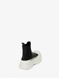 Black calf leather Chelsea boot with an oversized rubber tread sole. The boot is detailed with a textured rubber wrap and tonal Alexander McQueen signature, finished with a signature ribbon on the back of the boot. Round-toe boot silhouette with rubber toe cap detail. Material: 100% Calf Leather