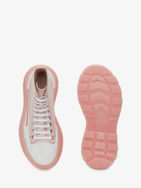 Tea rose calf leather boot with a tonal transparent lightweight oversized rubber tread sole. The boot is detailed with a textured rubber wrap and tonal Alexander McQueen signature, finished with a signature on the back of boot. Round toe shape silhouette and rubber toe cap. Comes with white and tea rose laces. Material:100% Calf leather Product Code:702041WHZ6D6898