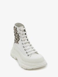 White canvas lace-up boot featuring Crystal Cloud embroidery with a lightweight oversized rubber tread sole. The boot is detailed with a textured rubber wrap and tonal Alexander McQueen signature, finished with a signature ribbon on the back. Round toe shape boot silhouette detailed with rubber toe cap. Comes with two sets of white laces. Material: 100% Cotton