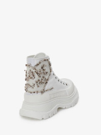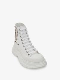 White canvas lace-up boot featuring a Tree Graffiti embroidery and a lightweight oversized rubber tread sole. The boot is detailed with a textured rubber wrap and tonal Alexander McQueen signature, finished with a signature ribbon on the back. Round toe shape boot silhouette detailed with rubber toe cap. Comes with two sets of white laces. Material:100% Cotton Product Code:710406W4TGB9423