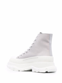 Tread Slick boots First seen on Alexander McQueen's SS20 runway, the Tread Slick sneaker has taken on an array of new forms and colourways ever since. Here, it exists in a new, ultra-durable high-top almost boot-like style yet remains atop the House's signature and instantly recognisable chunky rubber sole. Highlights - Grey - Ankle-length - Branded heel counter - Round toe - Rubber toecap - Front lace-up fastening - Chunky rubber sole Made in Italy Composition Outer: Canvas 100% Lining: Rubber 100%, Calf Leather 100% SIZE & FIT Measurement HEEL 2.16 in(5.5 cm) HEIGHT 5.11 in(13 cm) Sole height 1.37 in(3.5 cm)