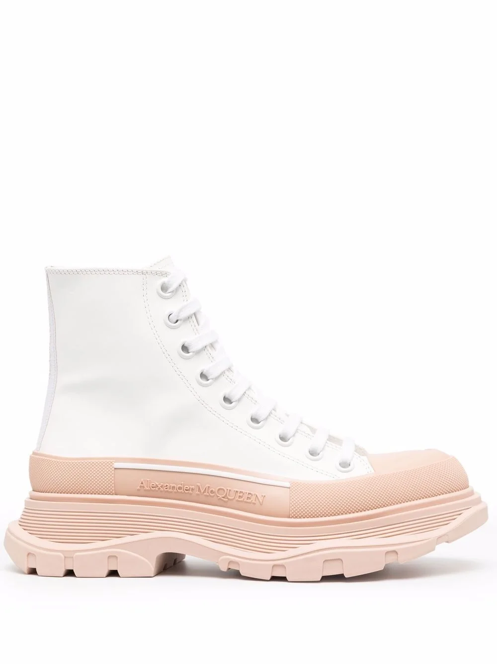 Tread Slick lace-up ankle boots First seen on Alexander McQueen's SS20 runway, the Tread Slick silhouette has taken on an array of new forms and colourways ever since. Here, they're presented in an ultra-durable high-top boot style, yet remain atop the house's signature and recognisable chunky rubber sole. Made in Italy Composition Leather 100% SIZE & FIT Measurement HEEL 1.96 in(5 cm) HEIGHT 5.51 in(14 cm) Sole height 1.37 in(3.5 cm)