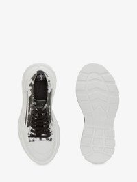 Black and white canvas lace-up with an oversized rubber tread sole featuring an all-over McQueen Graffiti print. The lace-up is detailed with a textured rubber wrap and tonal Alexander McQueen signature, finished with a signature ribbon on the back of boot. Round toe shape boot silhouette details rubber toe cap. Comes with black and white laces. Material:100% Cotton Product Code:708093W4TG59356