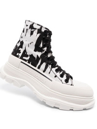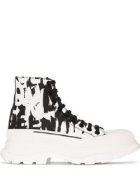 Treadslick graffiti-print sneakers Treadslick graffiti-print sneakers from Alexander McQueen featuring black/white, leather, all-over logo print, graffiti print, front lace-up fastening, ankle-length, round toe and flat rubber sole. Made in Italy Composition Outer: Fabric 100% Lining: Leather 100% Sole: Rubber 100% SIZE & FIT Model measurements Height 5 ft 9 in(1.76 m) Bust/Chest 33.5 in(85 cm) Hips 35.4 in(90 cm) Waist 23.6 in(60 cm) FittingInformation This piece fits true to size. We recommend you get your regular size Measurement CIRCUMFERENCE 9.4 in(24 cm) HEEL 1.8 in(4.5 cm) HEIGHT 5.7 in(14.5 cm) PLATFORM 1.4 in(3.5 cm)