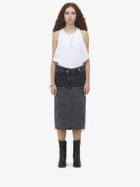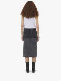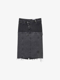 Denim low rise skirt. Two-tone black stonewashed denim with raw edge detail. Finished with an asymmetric button and zip fastening. Product details - Low rise - Raw edge - Asymmetric button and zip fastening - Made with organic cotton yarn - Product code: 802093QMACX1307 - Made in Italy