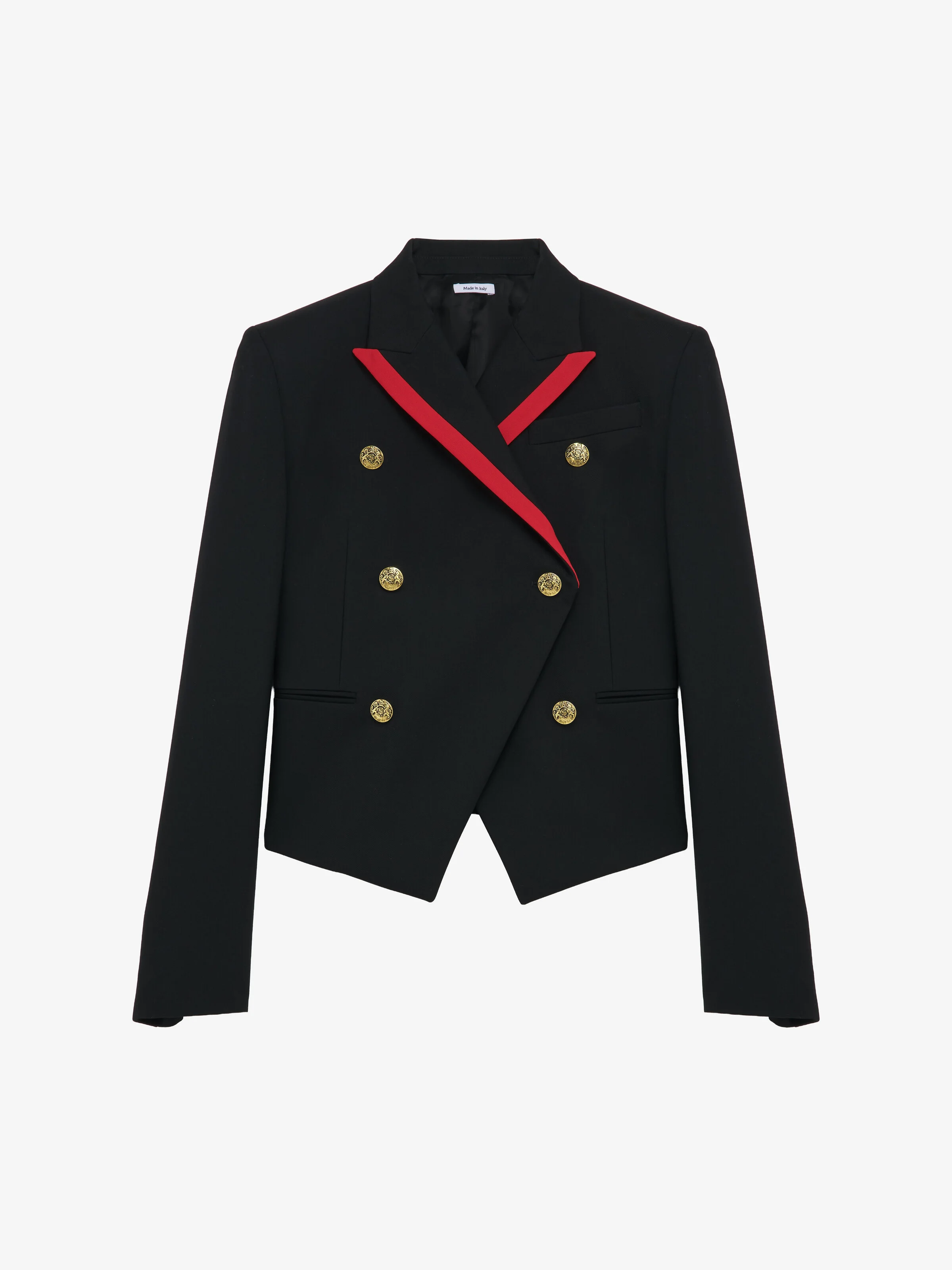 Uniform-inspired double-breasted jacket in black wool gabardine. Peak lapels with contrast red stripes, side jetted pockets and gold-tone buttons. Finished with a T-Bar chain back detail. Complete the look with the matching trousers. Product details - Peak lapels - Chest pocket - Button fastening - Product code: 861405QJADK1000 - Made in ITALY - Material: 100% Wool