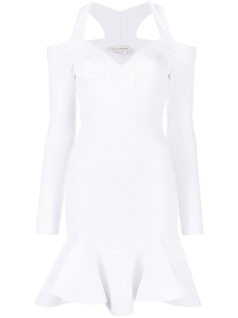 V-neck knitted mini dress Architectural silhouettes are part of Alexander McQueen's DNA, as the brand uses structural elements to showcase its impeccable craftsmanship. Here, the knitted dress is elevated by cut-outs at the shoulders and a bold ruffled hem. Highlights - V-neck knitted dress from alexander mcqueen featuring white, flared, knitted construction, cut-out detailing, v-neck, fitted waistline and thigh-length. Made in Italy Composition Viscose 74%, Polyester 15%, Polyamide 10%, Elastane 1% SIZE & FIT Model measurements Height 5 ft 10 in(1.78 m) Bust/Chest 31.49 in(80 cm) Hips 35.03 in(89 cm) Waist 23.62 in(60 cm) FittingInformation This piece fits true to size. We recommend you get your regular size Designed for a close fit at the bust, waist and hips Made with a mid-weight stretch fabric Washing instructions Dry Clean Only