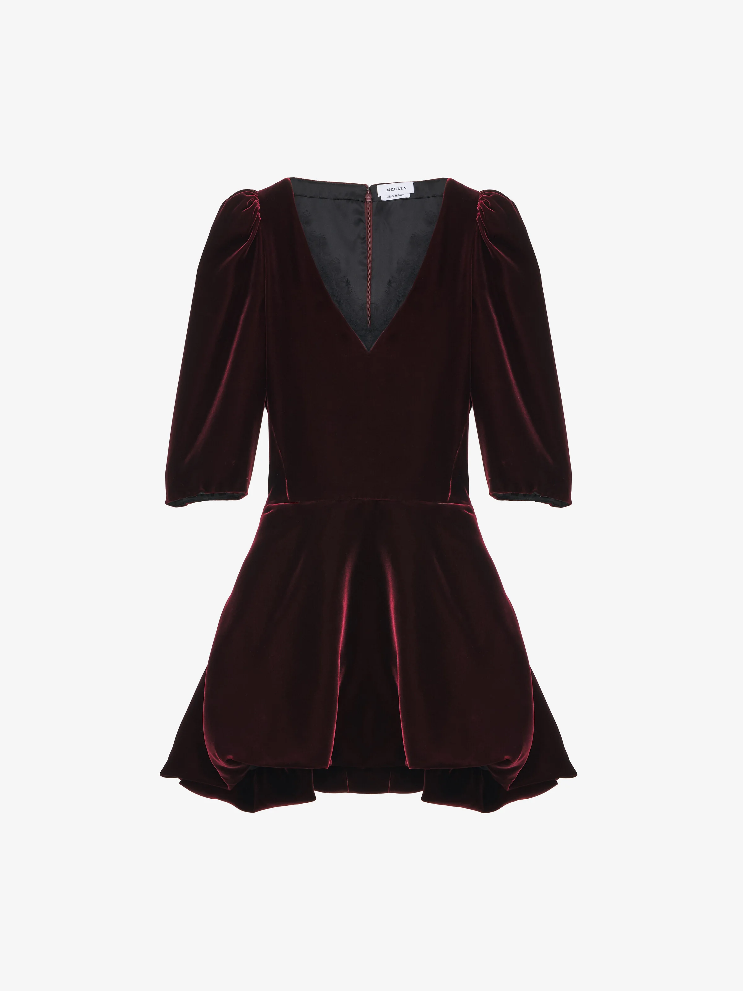 Mini dress in deep red velvet. V-neck with black lace detailing, gathered shoulders and half sleeves. Finished with a back zip fastening. Product details - V-neck - Half sleeves - Back zip fastening - Product code: 846376QEAGW6193 - Made in ITALY - Material: 69% Viscose, 31% Cupro