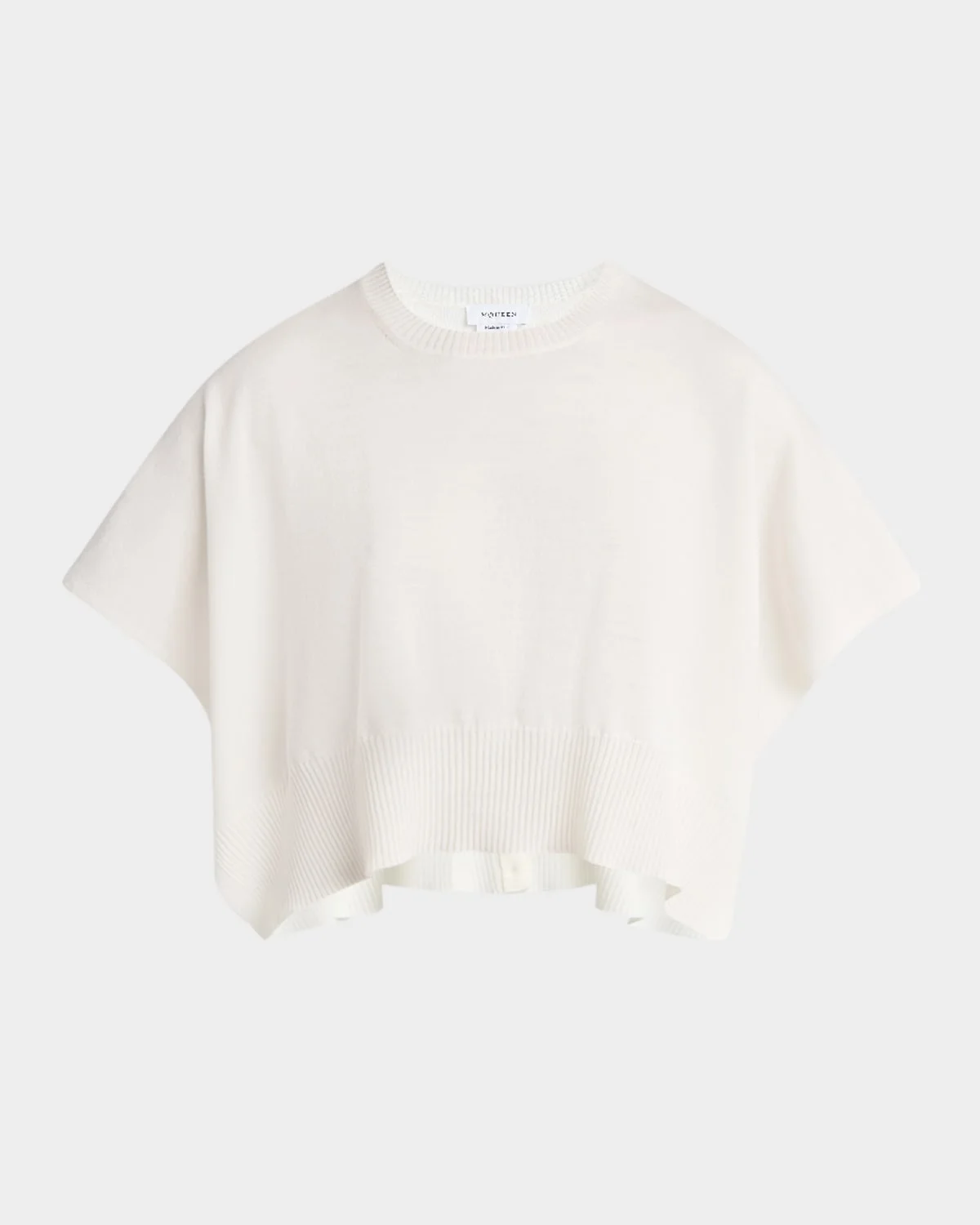 - McQueen "Volume" knit top finished with mother-of-pearl buttons along the back for versatile styling - Crew neckline - Short sleeves - Mini side slits - Relaxed fit - Cropped length - Pullover style - Wool/mother-of-pearl/viscose - Made in Italy
