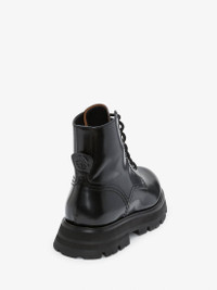 Black shiny spazzolato calf leather lace-up boot with top-stitch detailing and an exaggerated flared rubber lug sole. Boot silhouette with a round toe shape. Finished with an Alexander McQueen signature on tongue and Alexander McQueen seal logo in high relief on the heel counter. Material:100% Calf Leather Product Code:657569WHZ801000