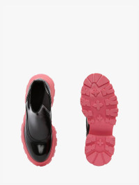 Black shiny spazzolato calf leather chelsea mid-height boot with top-stitch detailing and an exaggerated coral flared rubber lug sole and stacked heel. Boot silhouette with a round toe shape. Finished with an Alexander McQueen signature on tongue and Alexander McQueen seal logo in high relief on the heel counter. Material: 100% Calf Leather