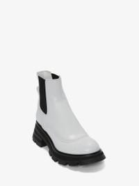 Ivory shiny spazzolato calf leather Chelsea mid-height boot with top-stitch detailing and an exaggerated flared rubber lug sole and stacked heel. Boot silhouette with a round toe shape. Finished with an Alexander McQueen signature on tongue and Alexander McQueen seal logo in high relief on the heel counter. Material: 100% Calf Leather
