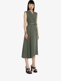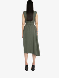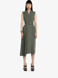 Asymmetric drape pencil dress in military green draped tailoring. The style features peak lapels, a slit pocket on the chest, a buckled waistbelt and a military pocket on the side. Product Details: • Fits true to size Material:77% Wool, 23% Cotton Product Code:733284QJACF3003