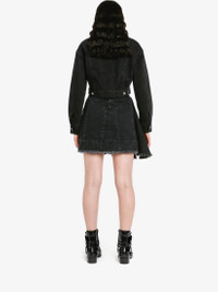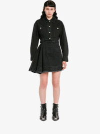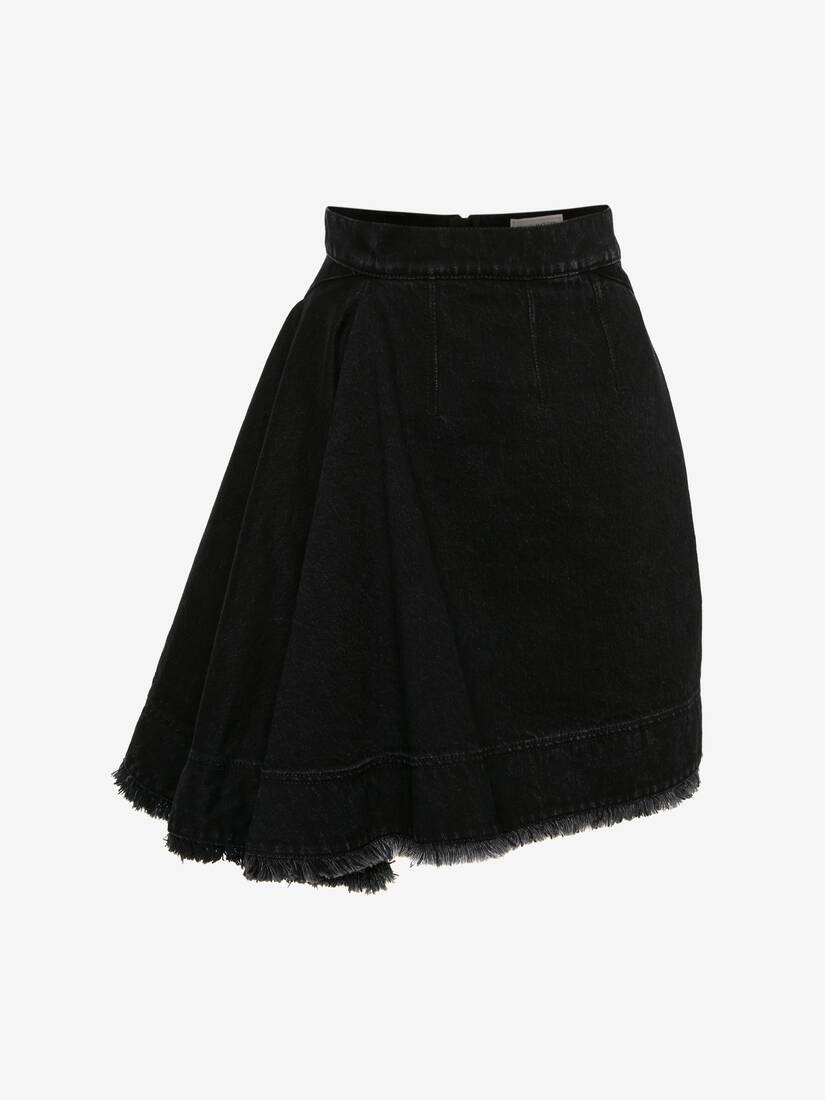 Asymmetric mini skirt in black denim featuring a raw hem and a back leather patch with an Alexander McQueen signature. Finished with a back zip fastening. Material:100% Cotton Product Code:720056QMAB51000