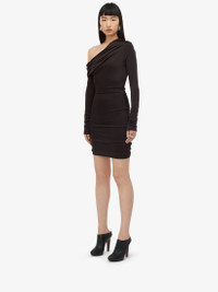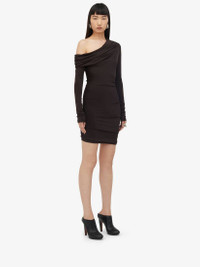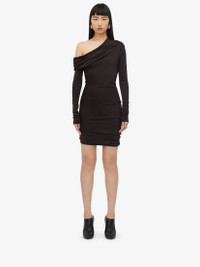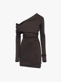 Mini dress in shiny ebony stretch jersey featuring an asymmetric neckline, drape detailing and long sleeves. Product details - Asymmetric neckline - Long sleeves - Made with certified viscose yarn - Product code: 794539QLADO3040 - Made in Italy