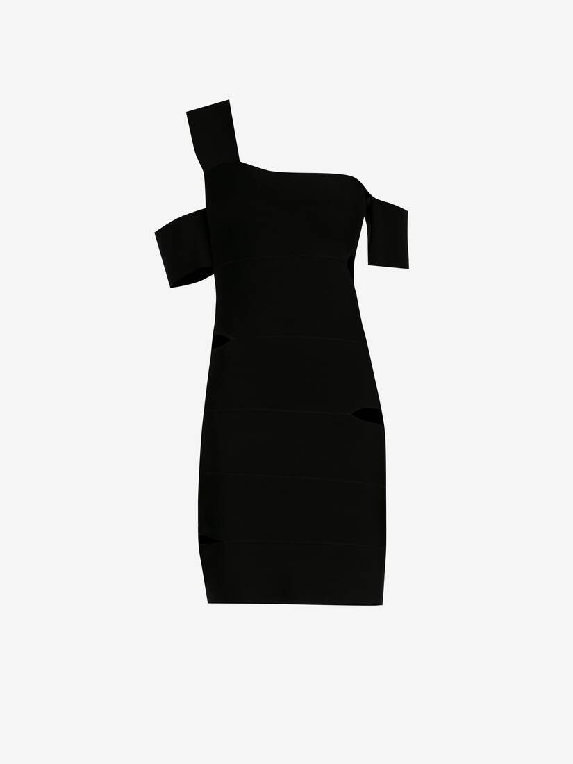Fitted bandage mini dress in black stretch viscose featuring a one-shoulder design and finished with slashed and zigzag stitch detailing. Product Details: - Contains certified viscose yarn Material:84% Viscose, 13% Polyamid, 3% Elastan Product Code:720566Q1A4C1000