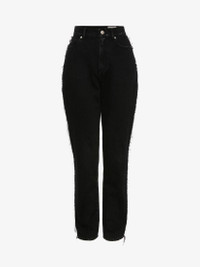 Black denim boyfriend jeans featuring a high rise and distressed detailing on the sides. Finished with a zip and button fastening.
