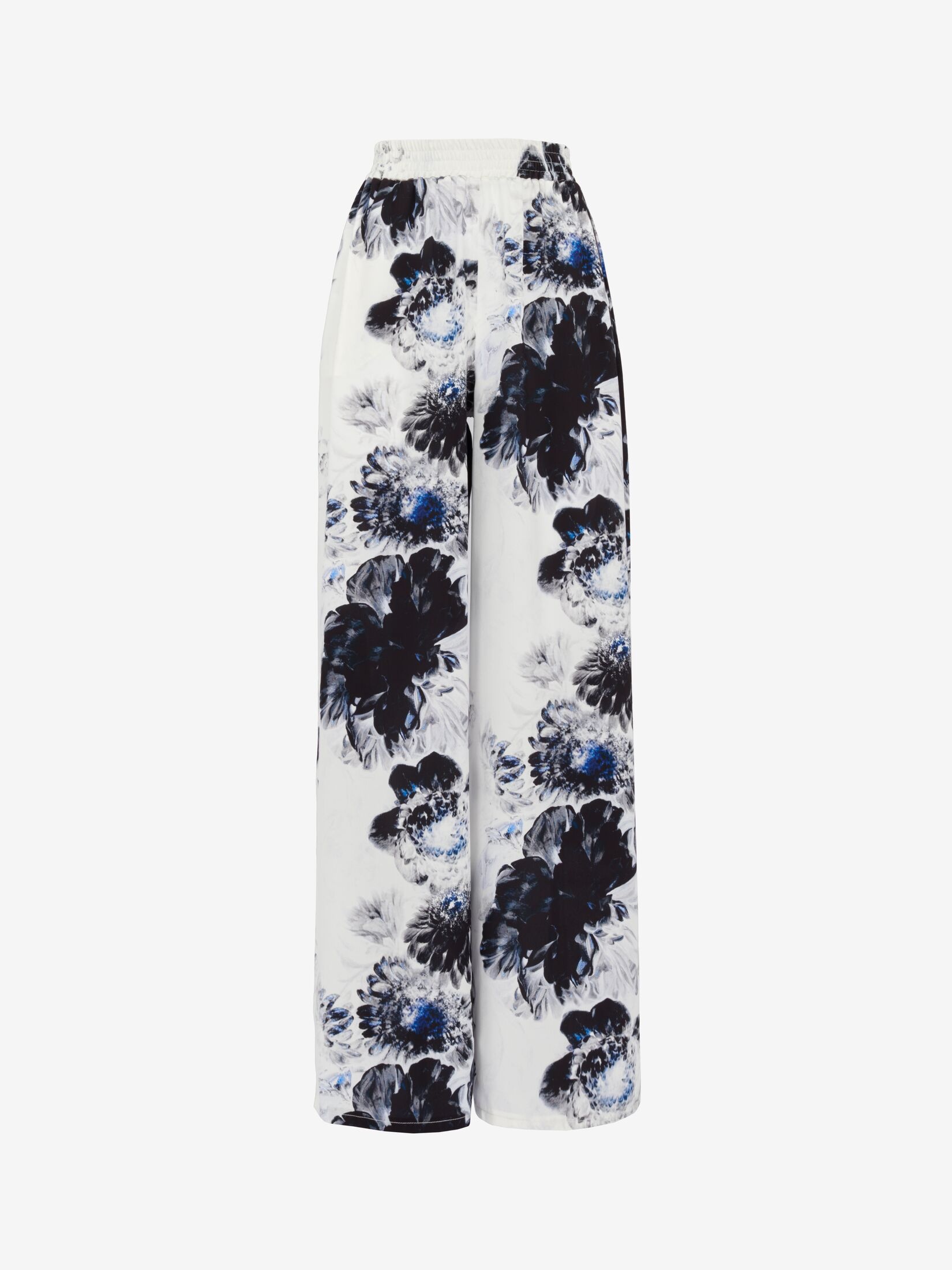 Pyjama trousers in white crepe de chine featuring a black,white and electric blue Chiaroscuro floral print. The trousers have a wide-leg silhouette and are finished with an elasticated high waist. Product details - Elasticated high waist - Wideleg silhouette - Made with organic silk yarn - Product code: 700838QZALG4243 - Made in Italy