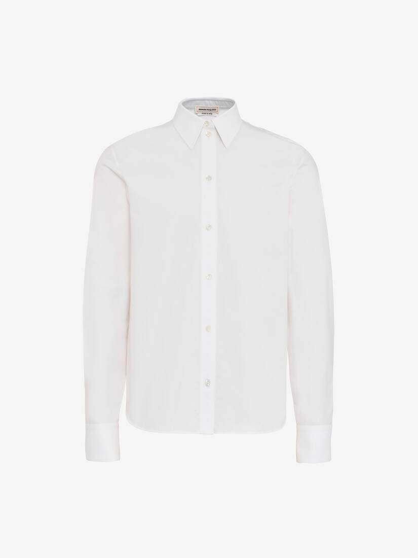 long-sleeve poplin shirt Alexander McQueen has been rooted in tailoring since its conception in 1992. Crafted from soft cotton, this white shirt features a front button fastening and long sleeves. Highlights - Optical white - Cotton - Straight-point collar - Front button fastening - Long sleeves - Buttoned cuffs - Straight hem Imported Composition Cotton 100%
