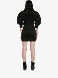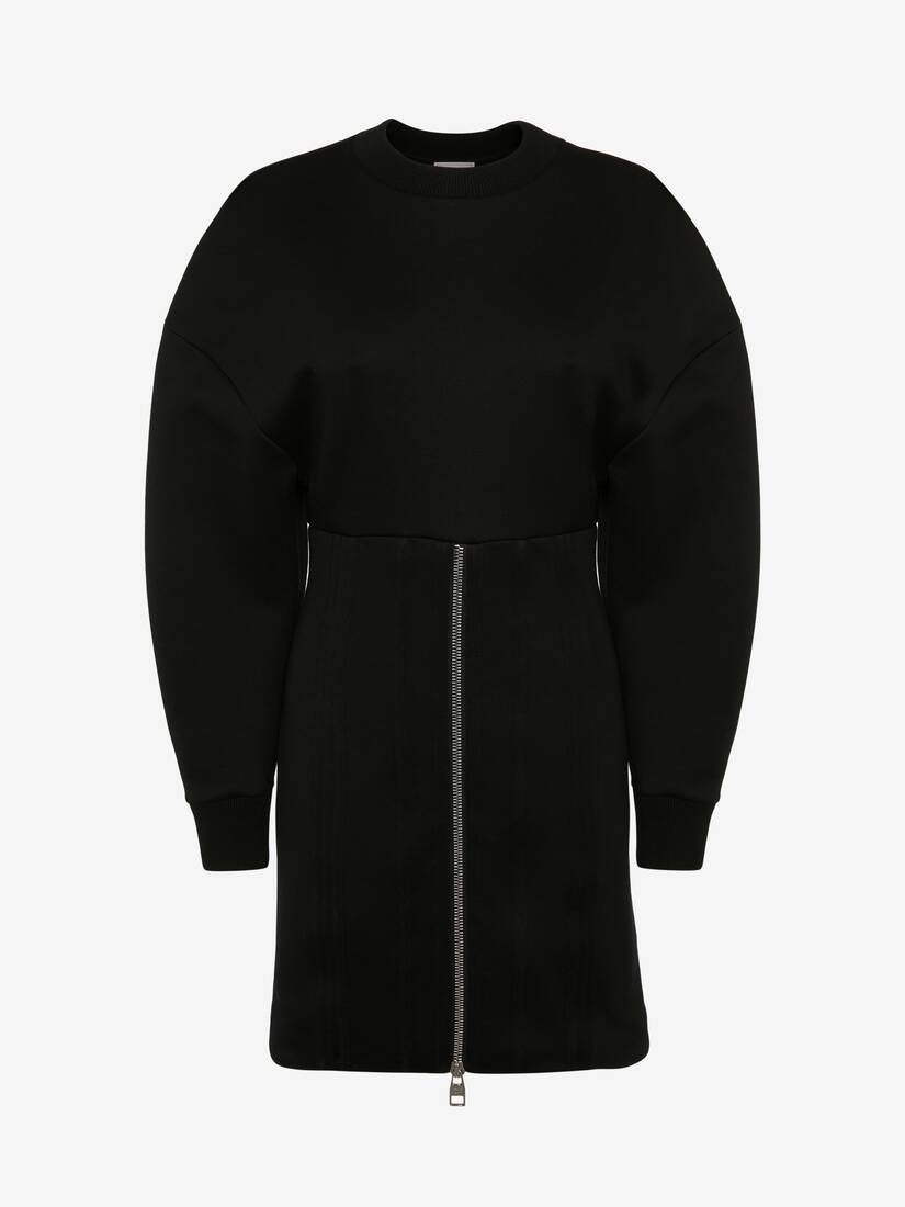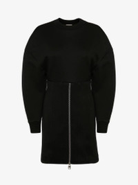 Black scuba mini dress with cocoon sleeves. The dress features a ribbed-knit crew neck, corset stitch detailling on the skirt and an elongated front zip. Finished with tonal Alexander McQueen embroidery on the back. Material:62% Cotton, 38% Polyamid Product Code:718462QLAA81000
