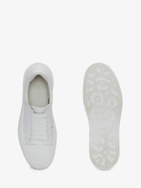Optic white leather lace up Deck Plimsoll with a thick oversized rubber sole. The lace-up is detailed with a rubber wrap sole and tonal Alexander McQueen signature. Round toe shape silhouette details rubber toe cap. Material:100% Calf Leather Product Code:697121WIAB69065