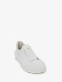 White canvas lace up Deck Plimsoll with a thick oversized rubber sole. The lace-up is detailed with a rubber wrap sole and tonal Alexander McQueen signature, finished with a suede heel counter. Round toe shape silhouette details rubber toe cap. Product Details: • The style fits true to size Material:80% Cotton, 20% Calf Leather Product Code:697120W4MV79000