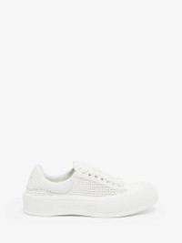 White raffia lace-up Deck Plimsoll with a nappa leather heel counter and a thick oversized rubber sole. The lace-up is detailed with a rubber wrap sole and tonal Alexander McQueen signature. Round toe silhouette detailed with a rubber toe cap. Product Details: • Round toe with rubber toe cap • Lace-up closure • Alexander McQueen signature • Oversized rubber sole • Additional pair of shoelaces included • To lessen our environmental impact and to reduce cotton consumption, we will no longer be providing a dust bag with our sneakers. Material:74% Polyethilene, 25% Nylon Product Code:755634W4WA39065