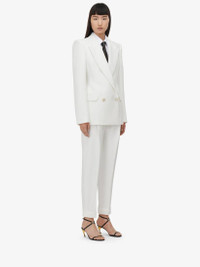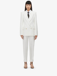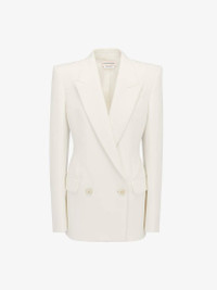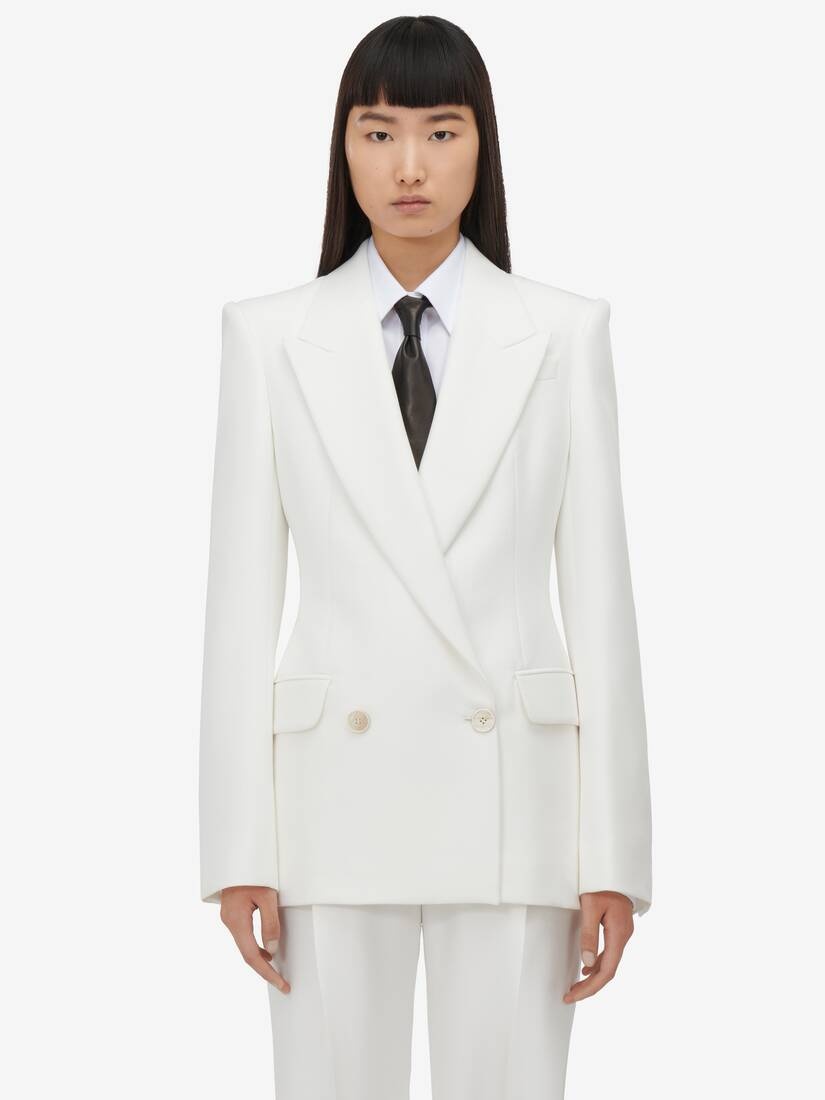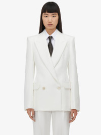 Double-breasted tailored jacket in optic white viscose cady featuring a low neck drop and wide lapels. The dropped lapel and the low placement of the buttons play on proportions by visually elongating the silhouette. Product details - Peak lapels - Slit pocket on the chest - Front side flap pockets - Made with certified viscose yarn - Product code: 768488QEAE59000 - Made in Italy