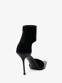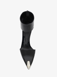 Black patent leather pump featuring a pointed toe silhouette detailed with a silver-finish punk metal toe cap. Finished with a harness-shaped ankle cuff with zip fastening, a tonal sole and a stiletto heel. Product Details: - Heel height: 105mm Material:100% Calf leather Product Code:718859WHJUM1081