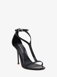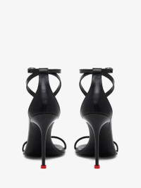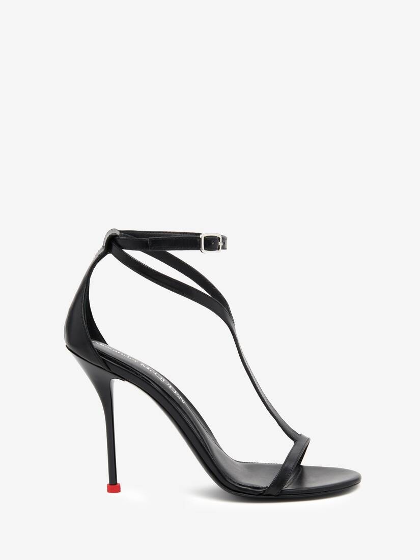 Black leather naked sandal featuring a round toe silhouette and a T-bar upper inspired by the iconic harnesses of the House. The sandal is finished with a tonal lacquered pin heel and signature lust red heel tip. Product details - Round toe - Lacquered pin heel - Leather sole - Heel height: 90mm - Product code: 790111WIFD11037 - Made in Italy
