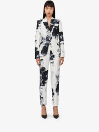High-waisted cigarette trousers in white viscose cady featuring a a black, white and electric blue Chiaroscuro floral print. The trousers are detailed with two side pockets and a welt pocket on the back. Finished with a concealed zip and hook fastening. For the full look, wear with the matching jacket. Product Details: • Belt loops • Side pockets • Concealed zip and hook fastening • Made with certified viscose yarn Material:100% Viscose Product Code:585809QZALD4243