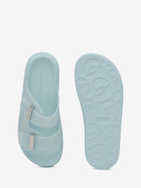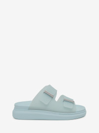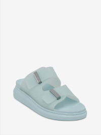 Rubber hybrid slide in powder blue featuring two straps with silver-finished bar slides, each engraved with an Alexander McQueen signature. The slide is finished with an oversized rubber sole. Product details - Round toe - Silverfinished hardware - Embossed Alexander McQueen signature on the upper - Oversized rubber sole - Sole height: 35mm / insole 15mm - Product code: 658063W4TM14711 - Made in Italy