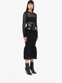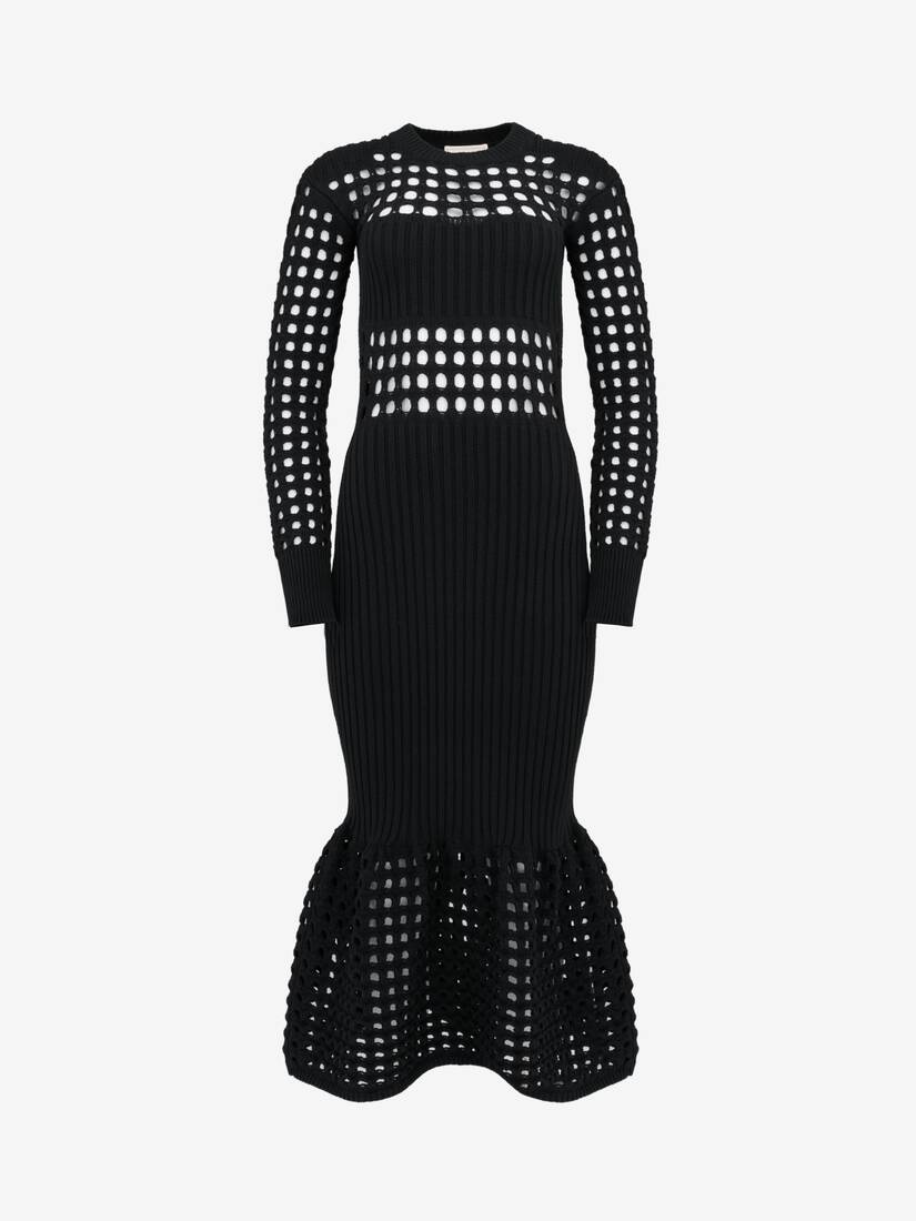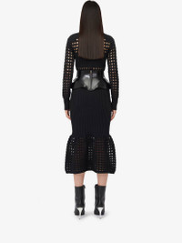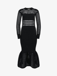Black cotton midi dress featuring 3D mesh and solid rib panels. The dress is detailed with a crew neck and a flared skirt. Product Details: • Crew neck • Long sleeves • Flared skirt Material:74% Cotton, 26% Polyamide Product Code:780455Q1A8M1000